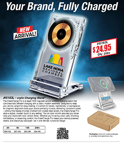 The ClearCharge Pro is a sleek 15W acrylic wireless charging stand that combines fast, efficient charging with a clean, modern aesthetic. Designed to keep your phone upright for easy viewing, it's perfect for use on desks, nightstands, or workspaces. The magnetic alignment ensures your device locks into place every time, delivering consistent power without the hassle of cords. Its crystal-clear acrylic construction adds a stylish touch to any setting, while the integrated full-color imprint gives you the opportunity to showcase your brand with bold, vibrant detail. Whether you're taking video calls, checking notifications, or streaming content, the ClearCharge Pro keeps your device powered and within view - all in one refined, functional design.
