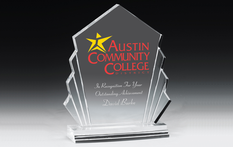 The Legend awards feature 3/4" thick layered acrylic that is machined to create a cascading effect. They are set on triple layered bases for height, stability and strong recognition visibility. They can be Screen Printed, Laser Engraved or 4 Color Process Printed.