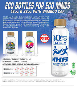The Clearly Reusable Bottle is made from eco-friendly 100% RPET (recycled water bottle material) and the cap is made from bamboo and some plastic. It features the grace and sophistication of a clear glass bottle at a fraction of the cost. BPA Free. Meets FDA requirements. Up to a Four Color imprint on the front, front and back, or full wrap included – no extra run or set up charges.