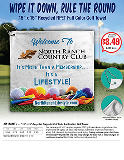 Our extra-large 15” x 15” recycled polyester RPET golf towel offers a huge billboard like imprint area with up to a full color, edge to edge, sublimation imprint (reverse side is white). Soft, absorbent, lightweight and quick drying.